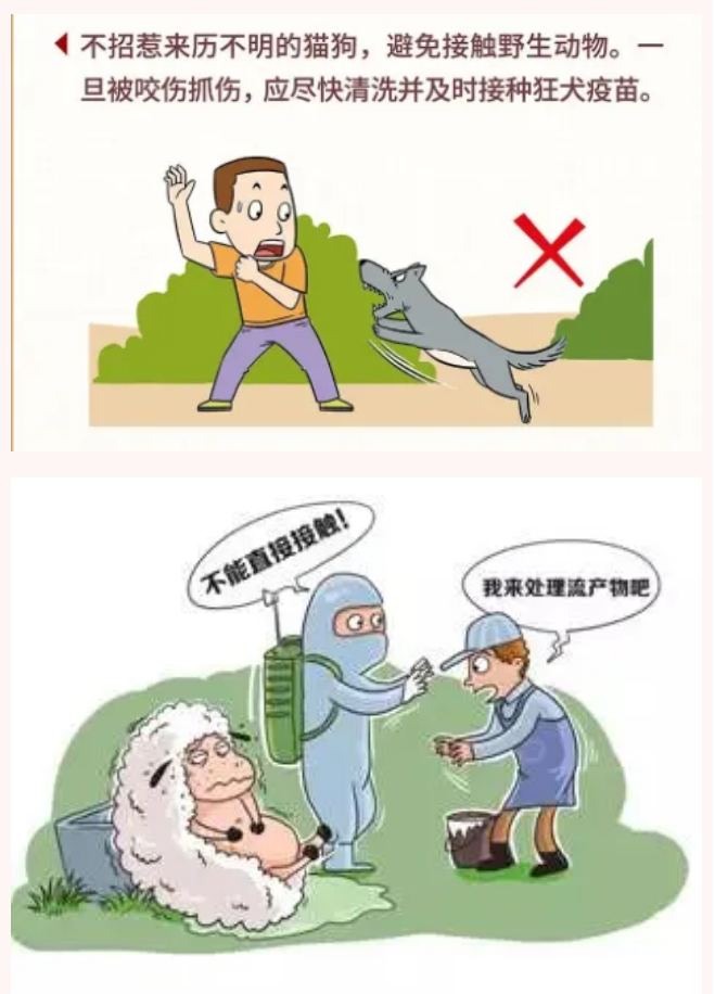 春夏季动物繁殖期容易伤人,在外不招猫逗狗,避免接触野生动物,不要接触流产的牛羊,以及病禽、死禽。