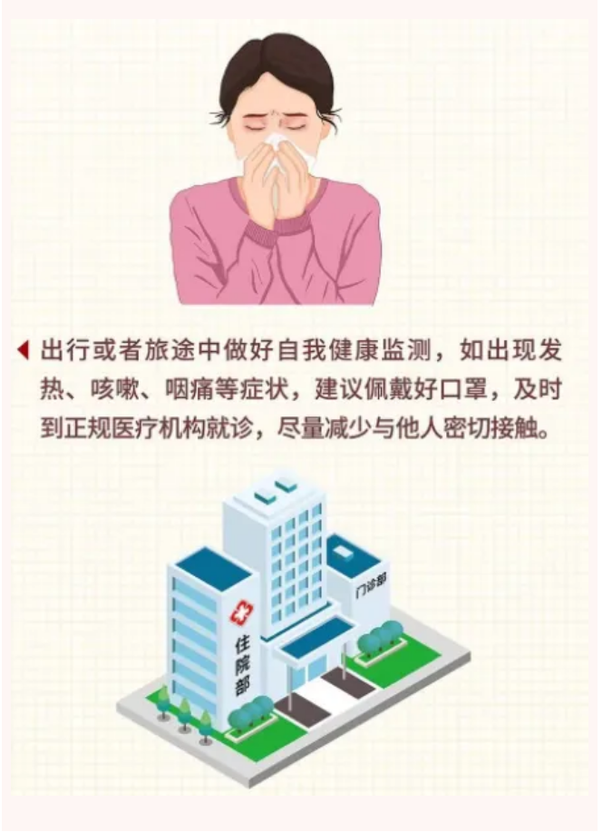 旅途中出现发热、咳嗽、咳痰、呕吐、腹泻等不适症状,应停止旅行活动并及时就医。旅行归来后,请密切关注自身和家人健康状况,如出现不适症状,请及时到医疗机构就诊。