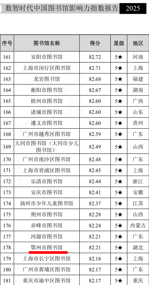 《报告》从基础实力、网站影响力、新媒体影响力、社会影响力、学术影响力五大维度进行全面评估。鄂州市图书馆的入选与排名提升,是对其过去一年持续推进服务体系现代化转型、深耕本地文化服务、积极融入全省公共文化发展格局所取得成绩的集中肯定。